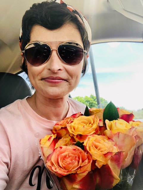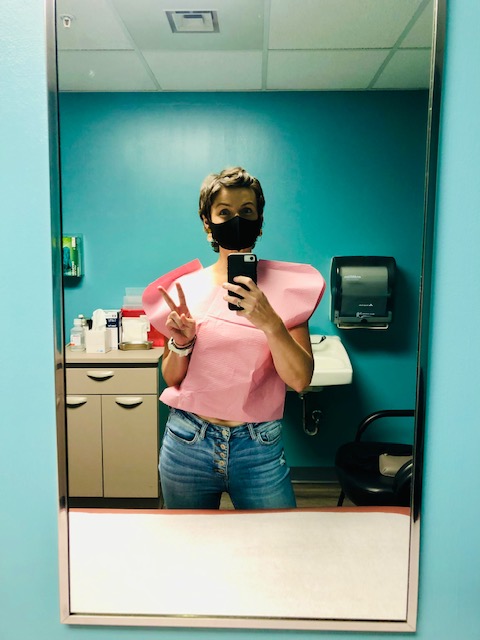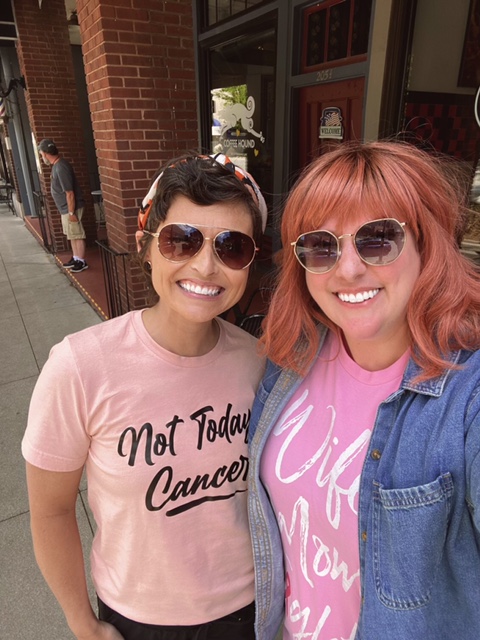 Due to ongoing restrictions driven by COVID I was welcomed to the active treatment space all 16 times with the sign “NO GUESTS ALLOWED PAST THIS POINT. PLEASE STAY OUT OF TREATMENT AREA!” Never once was I allowed to have anyone sit in that space with me. Imagine my excitement when I looked up from my word search puzzle on Thursday to see Cassie — fellow breast cancer fighter extraordinaire — walking my way! Decked out in her pink wig, carrying flowers and on her way to sit with me for the final 15 or so minutes of my treatment. It was really special, and I am very thankful my nurse helped make it happen. Since Cassie is technically a patient at the Cancer Center we only slightly bent the rules (shhhhhh, don’t tell).