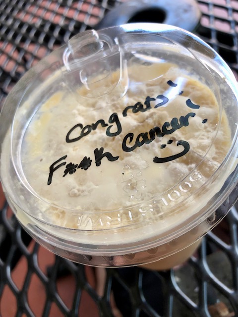 On days when I would feel ok after my infusion I would swing by the local coffee shop to grab a drink. I decided to stick with tradition and do the same after this last infusion. It was an absolutely gorgeous day, so sitting outside to take it all in was exactly what felt right. I walked in to order my drink and the gal behind the counter (with short, pink hair) mentioned she liked my headscarf. I smiled big, told her I’d actually just finished up my last treatment for breast cancer and that headbands are the only thing keeping these crazy locks semi under control. She squealed and exclaimed the peppiest congratulations. This was what greeted me at the end of the counter when my drink was done being prepared by the smiling barista. Yes, this sentiment exactly.