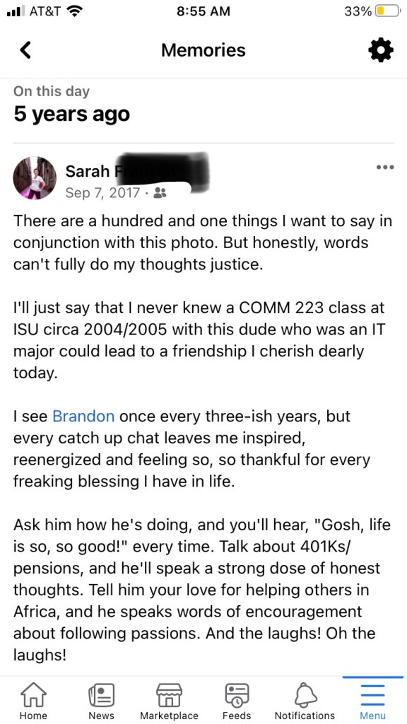 To start, allow me to share with you a memory from five years ago that popped up on my social media this morning.