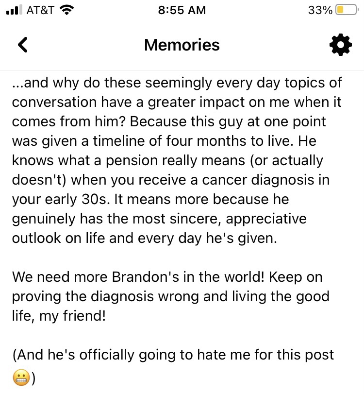 I sent Brandon the social media memory that popped up from four years earlier (the same one I shared above in this post) with a note that said, “Four years ago?! Amazing how you inspired me then, and at the time I had no idea I’d be walking through a cancer diagnosis. Thanks for showing me how to go about it boldly and bravely.”